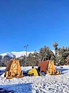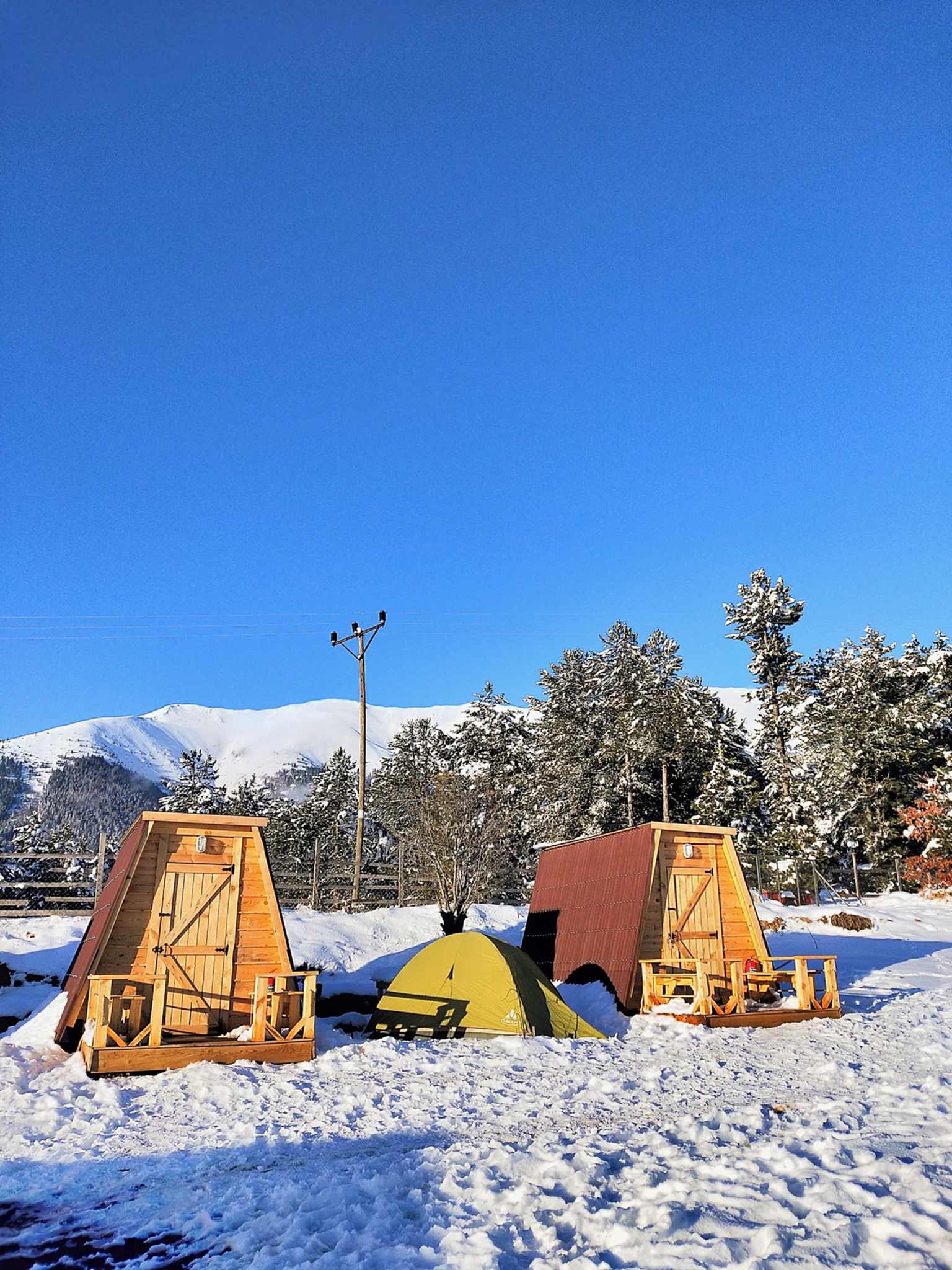 Azerbaycan'da kamp yaparken güneş ışığını engelleyen perdelerle korunan 4 cam tavanlı kulübe bulunmaktadır. Konforlu ve doğayla iç içe bir deneyim için 170*200 cm yataklı 2 kulübe tercih edilebilir.